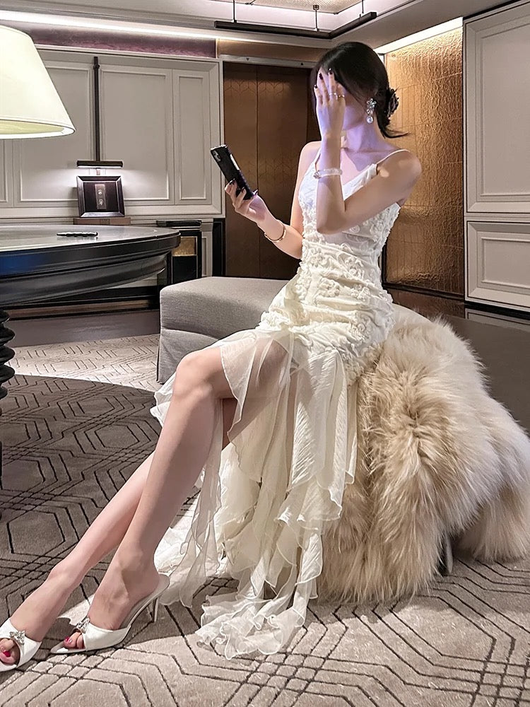 Pretty Mermaid Spaghetti Straps White Floral Prom Dresses Long Evening Gowns HZ1022