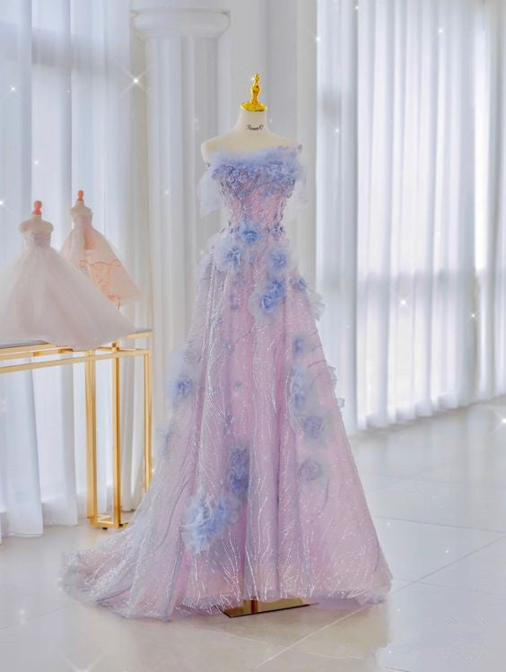 Elegant A line Strapless Tulle Floral Prom Dress HZ1022